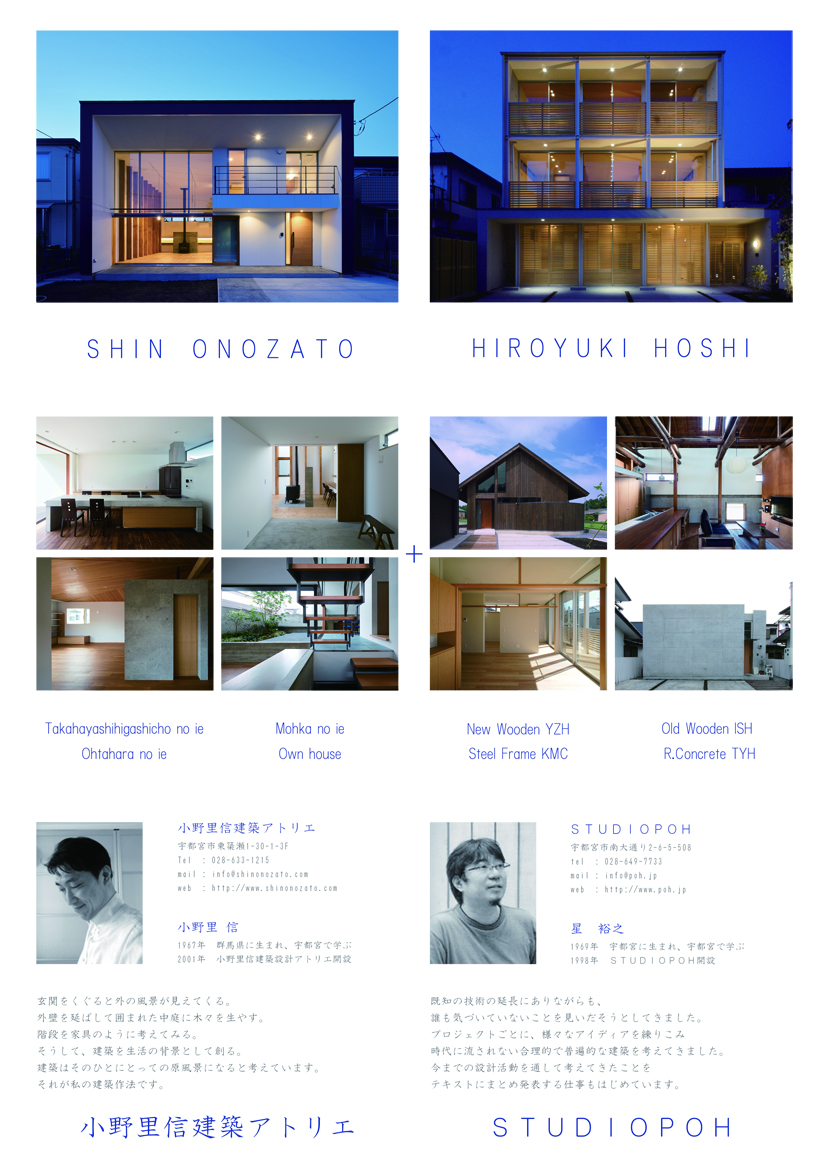 DESIGN・空間 展 自分スタイルの「家」みつけてみませんか? 2007年2月22〜26日、栃木県総合文化センター(第2ギャラリー)で クリエイティブに活動する建築家3組による建築展を行いました。 500人を超える来場者のなか、盛況のうちに終わることができました。 「こんな家づくりもある」ということを、これからも展示会を重ねて広く伝えていきたいと思っています。 年に2回くらい、開催していきますので、ホームページをチェックしてみてください。 ご来場いただいた方々、フライヤー設置にご協力いただいた方々、関心をもっていただいた方々に感謝いたします。 ありがとうございました。 ![]() 出展者 Studio Green Blue 小野里信建築設計アトリエ STUDIO POH |